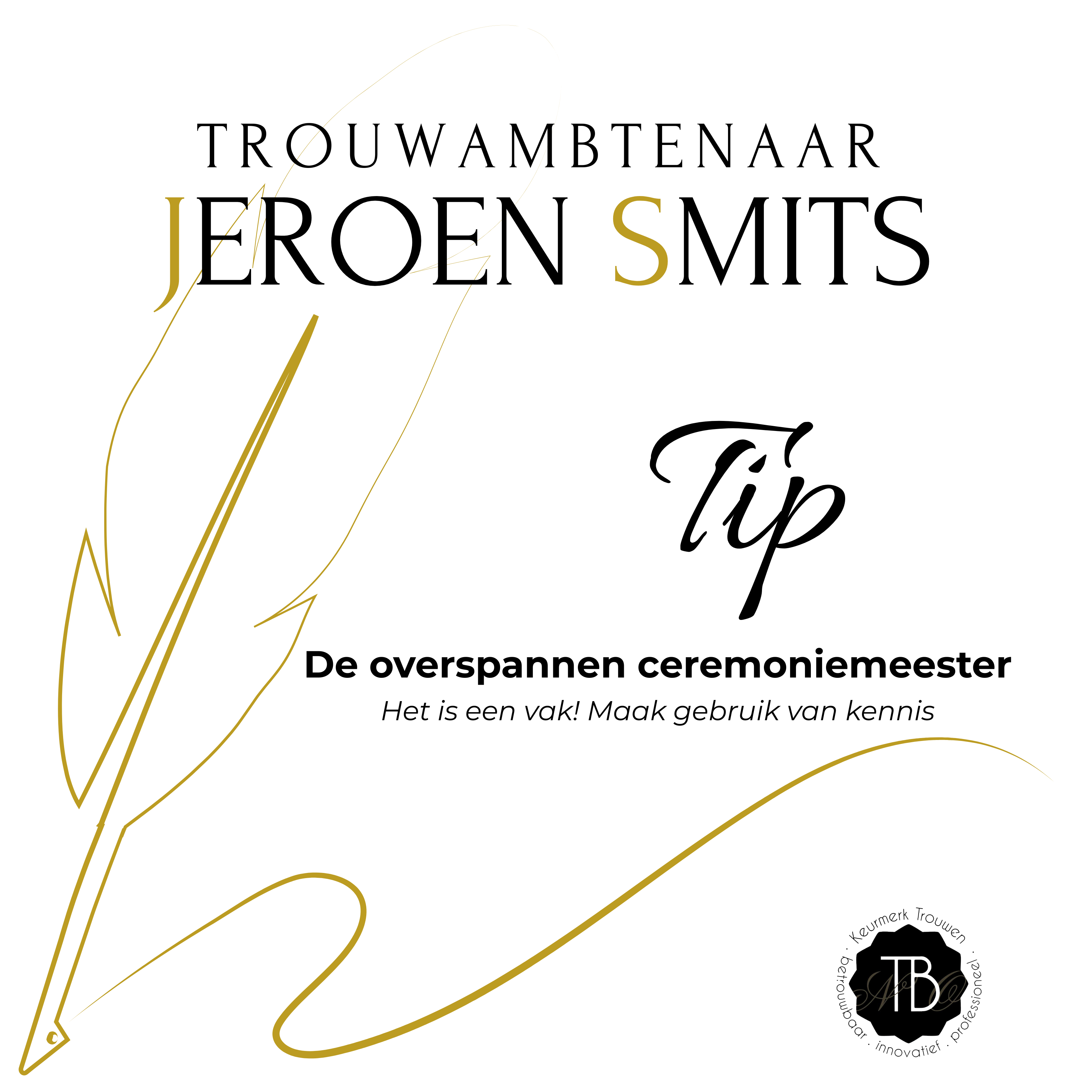 - Op 12 juli beleefden wij de mooiste dag van ons leven. En wat een geluk dat Jeroen Smits onze trouwambtenaar was! Vanaf het eerste moment zorgde hij voor een ontspannen sfeer. Met zijn vrolijke energie, grappige opmerkingen en luchtige manier van vertellen voelde het alsof hij ons al járen kende. Hij wist precies de juiste balans te vinden: een vleugje humor, een flinke scheut warmte en net genoeg serieuze woorden om het écht speciaal te maken. Dylan & Cheryl
