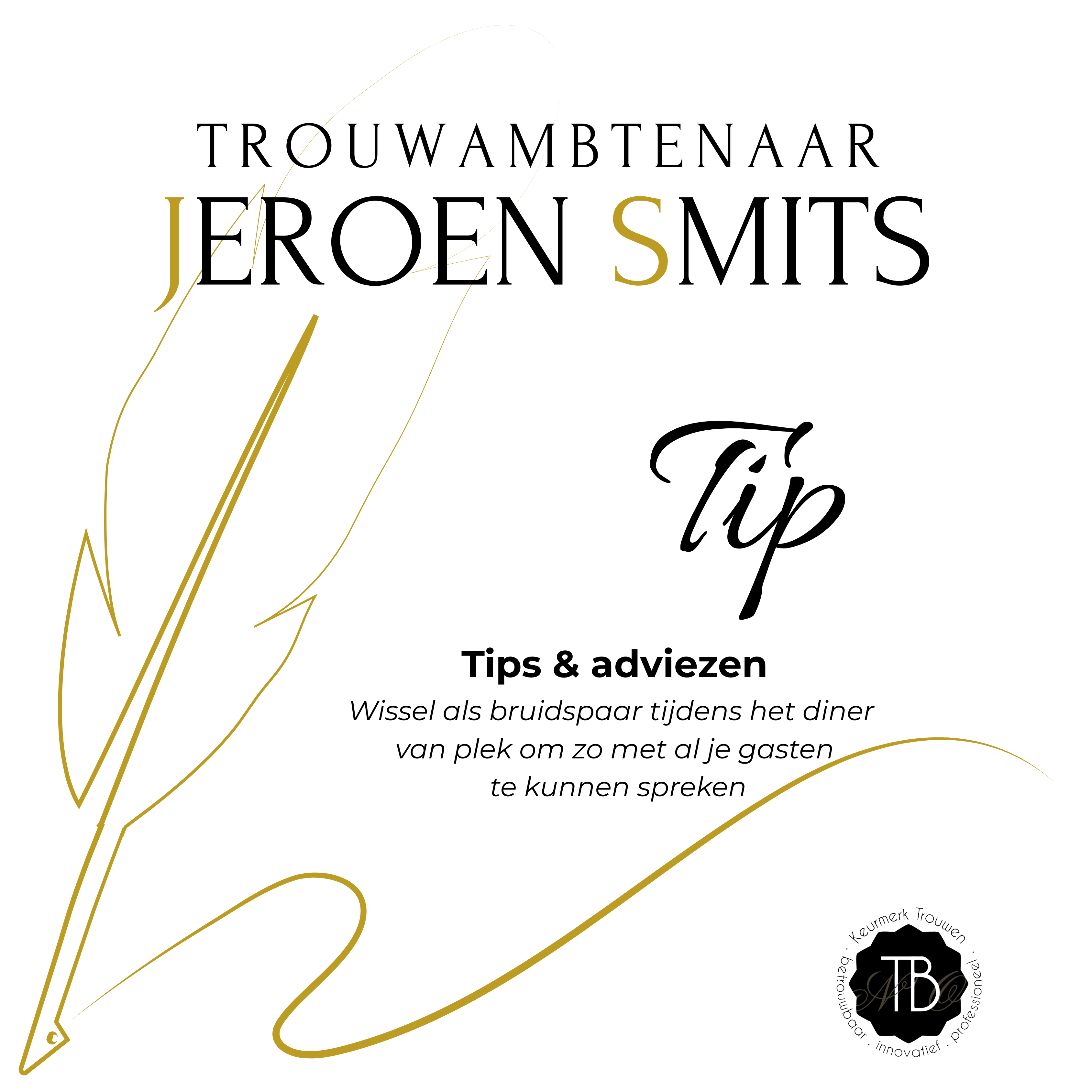 - Op 12 juli beleefden wij de mooiste dag van ons leven. En wat een geluk dat Jeroen Smits onze trouwambtenaar was! Vanaf het eerste moment zorgde hij voor een ontspannen sfeer. Met zijn vrolijke energie, grappige opmerkingen en luchtige manier van vertellen voelde het alsof hij ons al járen kende. Hij wist precies de juiste balans te vinden: een vleugje humor, een flinke scheut warmte en net genoeg serieuze woorden om het écht speciaal te maken. Dylan & Cheryl